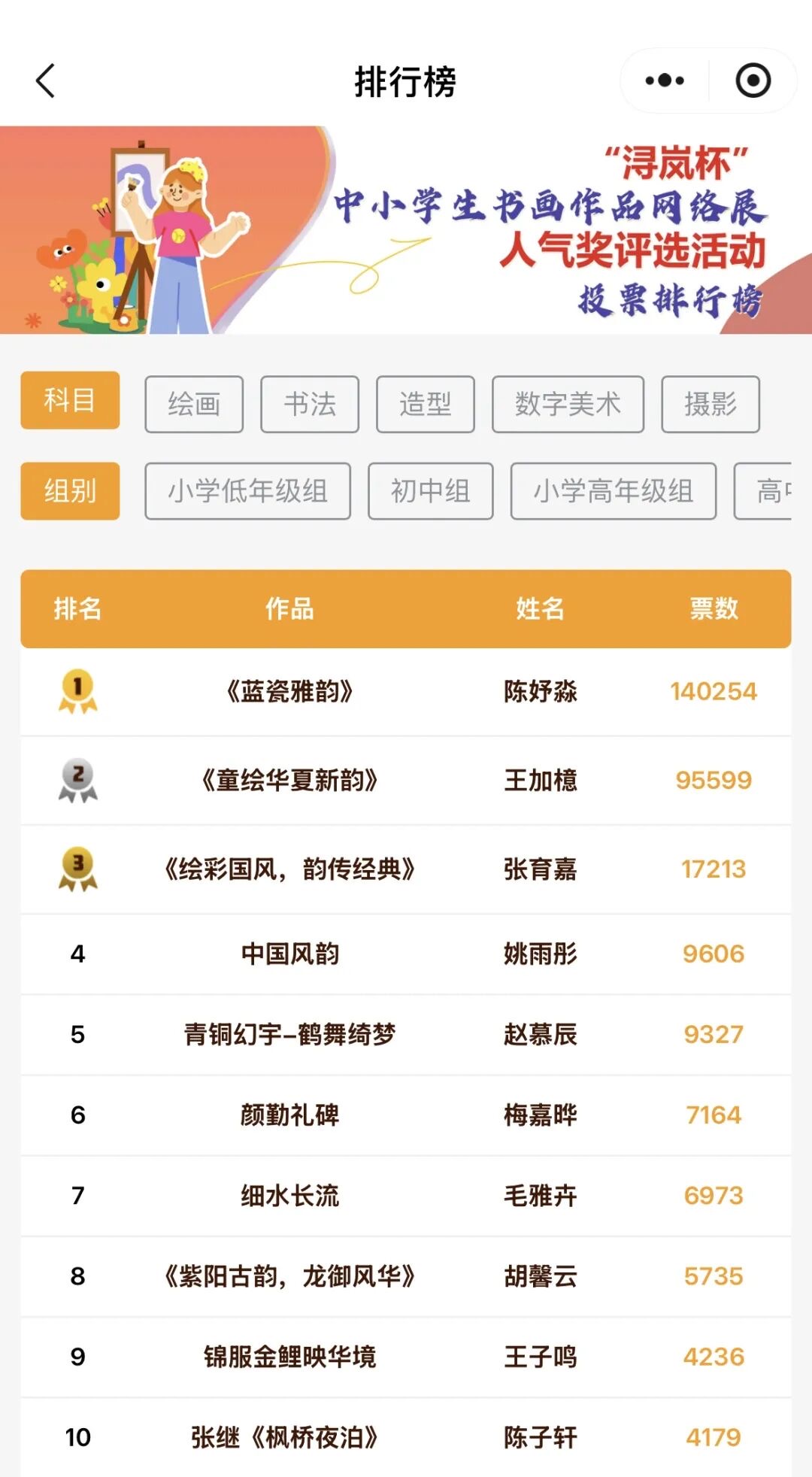 9月19日,“浔岚杯”第四届(2025)中小学生书画作品网络展人气奖评选活动正式收官。历经8天大众网络票选,目前获奖名单已正式确定,将于近日面向社会公示,敬请关注。