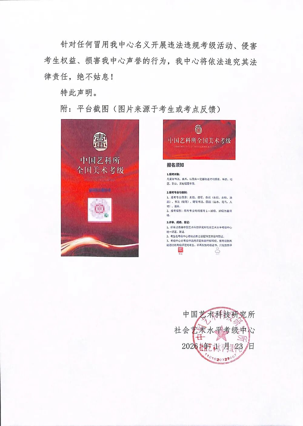 中国艺术科技研究所社会艺术水平考级中心严正声明:将依法追责,绝不姑息!