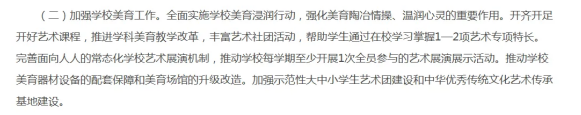 (二)加强学校美育工作。全面实施学校美育浸润行动,强化美育陶冶情操、温润心灵的重要作用。开齐开足开好艺术课程,推进学科美育教学改革,丰富艺术社团活动,帮助学生通过在校学习掌握1—2项艺术专项特长。完善面向人人的常态化学校艺术展演机制,推动学校每学期至少开展1次全员参与的艺术展演展示活动。推动学校美育器材设备的配套保障和美育场馆的升级改造。加强示范性大中小学生艺术团建设和中华优秀传统文化艺术传承基地建设。